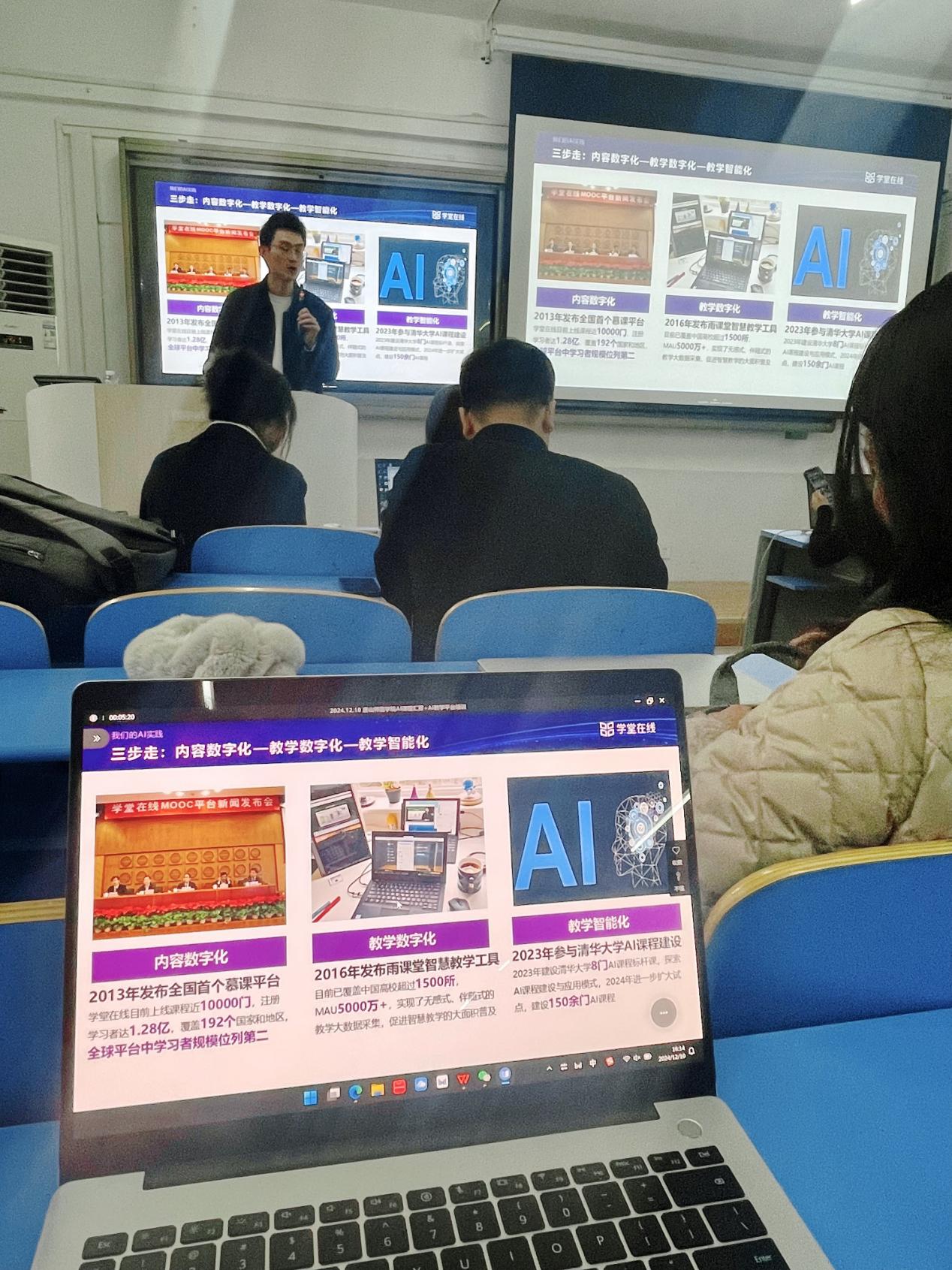 12月10日下午,为了推动信息技术与公司产品深度融合,公司举办了《AI雨课堂教学平台实操培训》的讲座,聚焦学堂在线AI课程建设&应用解决方案两大主题。