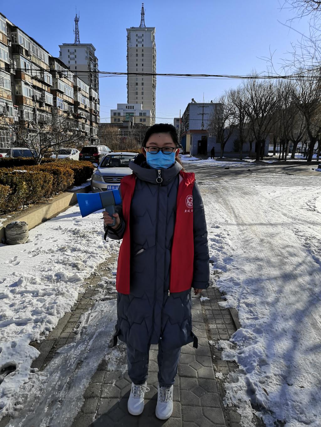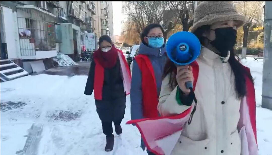 第一天加入志愿者,便受到了同行志愿者的夸奖与鼓励,她虽是志愿者中年纪最小的,掰围挡,走社区,喊喇叭,却也一个都不曾落下。在志愿服务期间,更是遇到了许多有趣的爷爷奶奶,会有戴口罩遛弯的爷爷突然走过来说哪里哪里的围挡被人撬开了,还会教她怎样的铁丝好用,而听到奶奶说“他们都是老员工,每天都这么走,可负责了”,口罩下的嘴角早就咧开了。她本着党员的义务与担当,遵循“疫情就是命令,防控就是责任”的号召,也想让大家看到,90后可以当家了,更是坚信我们终将赢得这场战役。