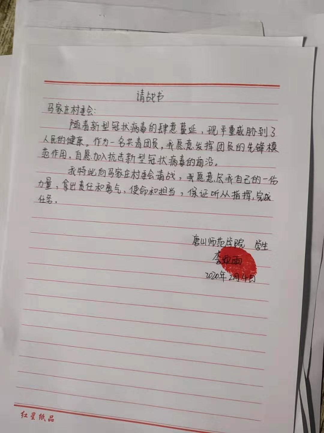 2020年2月4日,李迎雨同学了解新型冠状病毒蔓延情况及村委基层工作需求后,主动向马家庄村委会请战,自愿加入抗疫前沿。“我愿意尽我自己的一份力量,拿出责任和勇气、使命和担当,保证听从指挥,完成任务”,在防疫一线,李迎雨同学主要负责在村口值岗、为出入村人员测体温并做好信息登记工作,为防止疫情的传播与扩散起到了帮助作用,深受村民及村委的认可。
