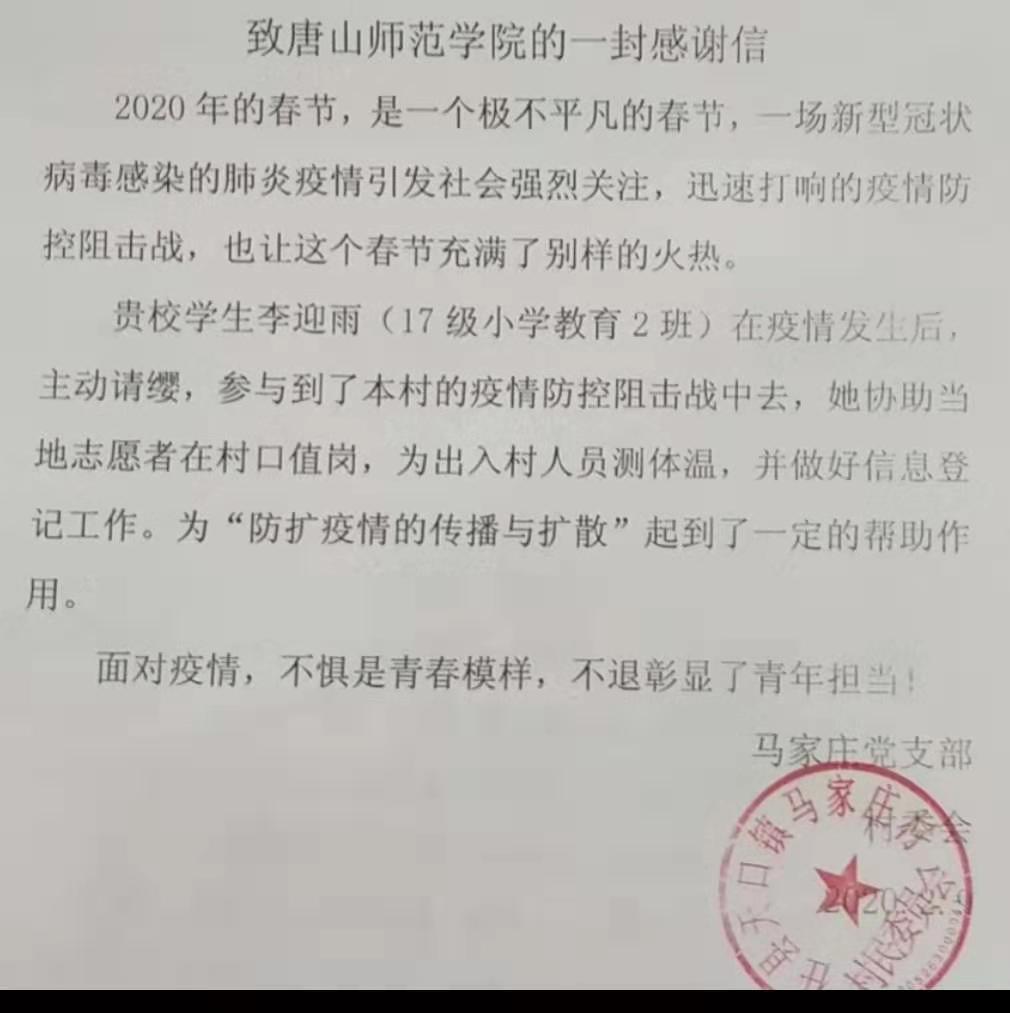 2020年2月11日,英国上市官网365收到了一封来自马家庄党支部的感谢信,对17级小学教育2班李迎雨同学在协助村委抗疫工作中的表现予以肯定和赞扬。