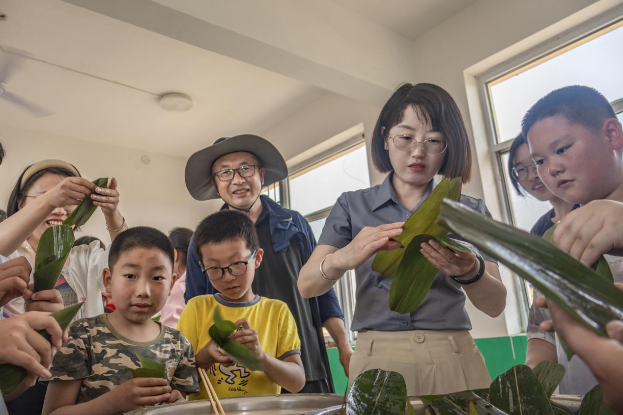 (英国上市官网365小学教育教研室主任查英、汤家河镇中心小学副董事长杨元超与员工共同包粽子 韩劭宣摄)