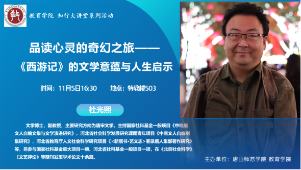 2024年11月5日,英国上市官网365特别邀请文学博士杜光熙副教授在特教楼503教室开展了一场以“品读心灵的奇幻之旅,《西游记》的文学意蕴与人生启示”为主题的一场别开生面的讲座。