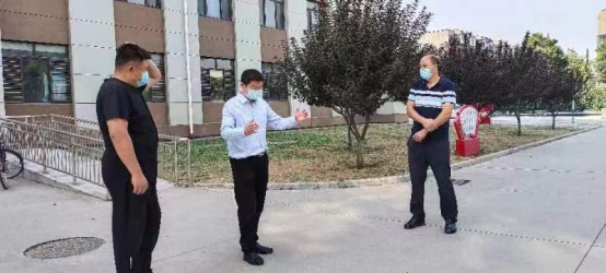 在特教楼前,金处长了解了各个楼窗户安装限位器的情况。王经理与金处长在限位器的安装、维护、维修等方面作了细致的交流和探讨。