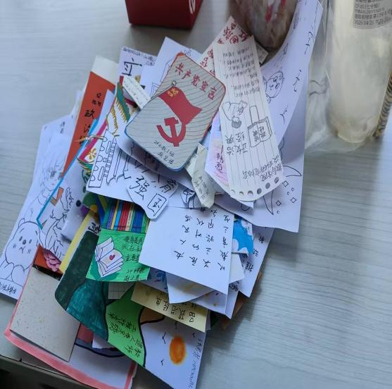 在制作过程中,同学们首先依据准备好的丰富政治经典素材,如经典著作片段、重要政策解读等,确定书签主题与设计思路,并精心挑选经典语句,接着,通过绘制草图、剪裁卡纸、书写文字、装饰图案等步骤,将经典语句巧妙融入设计,同时深入思考其内涵。这一过程不仅锻炼了同学们的辩证与批判性思维,更通过动手实践提升了创新能力,最终在创作成果中收获了自信心与成就感。