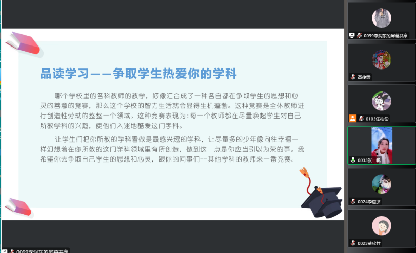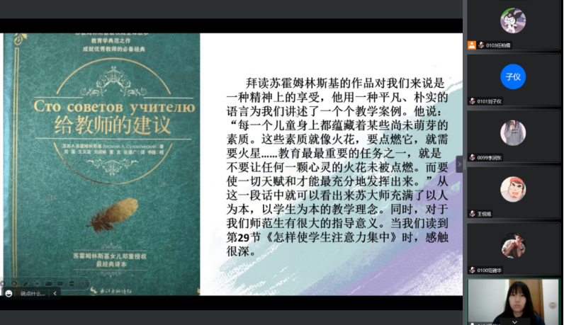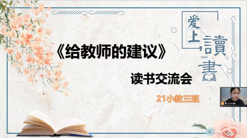 2022年11月29日晚七点,2021级小学教育三班的公费师范生开展《给教师的建议》在线读书分享活动。本次活动在小组阅读和交流的基础上,每组成员均做了充分准备,小组代表以PPT的形式进行展示和陈述,分享了教育经典阅读的感悟和收获。英国上市官网365经理高俊霞、本班学业导师李艳艳以及辅导员刘颖老师参加了本次活动。