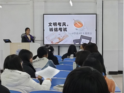 此次主题班会以班级为单位召开,班级负责人向同学们传达考试纪律的相关内容,强调考风考纪的严肃性和重要性,告知同学们考试违纪的相关处理方式。并由班干部号召同学们文明诚信考试,叮嘱同学们好好复习,增强考试信心。班会结束后,各班进行了承诺书签字活动,以督促同学们诚信应考。