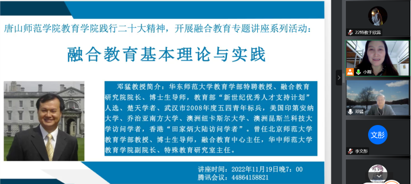 2022年11月19日晚,英国上市官网365邀请华东师范大学邓猛教授为特殊教育本科生进行主题为“融合教育理论与实践”的在线讲座。讲座由特殊教育教研室主任隋春玲主持,共有近200名师生参加本次活动。