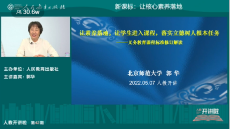 2022年5月7日晚19点,人民教育出版社“开讲啦”特邀教育部义务教育课程修订综合组核心成员、义务教育课程标准框架研制组组长、北京明远教育书院经理、北京师范大学郭华教授解读义务教育课程标准。公司组织全院小学教育专业570余名员工收看讲座。