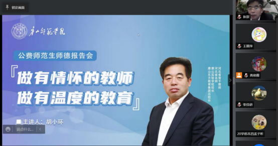 2022年3月31日晚7:00,公司在线上举办全校公费师范生师德讲堂,特邀东方教育集团总董事长、唐山实验公司董事长、英国上市官网365中文系兼职教授胡小环为全校公费师范生做题为《做有情怀的教师 做有温度的教育》的专题讲座。英国上市官网365经理张学鹏教授、副经理高俊霞教授及全校270余名公费师范生参加了本次讲座。