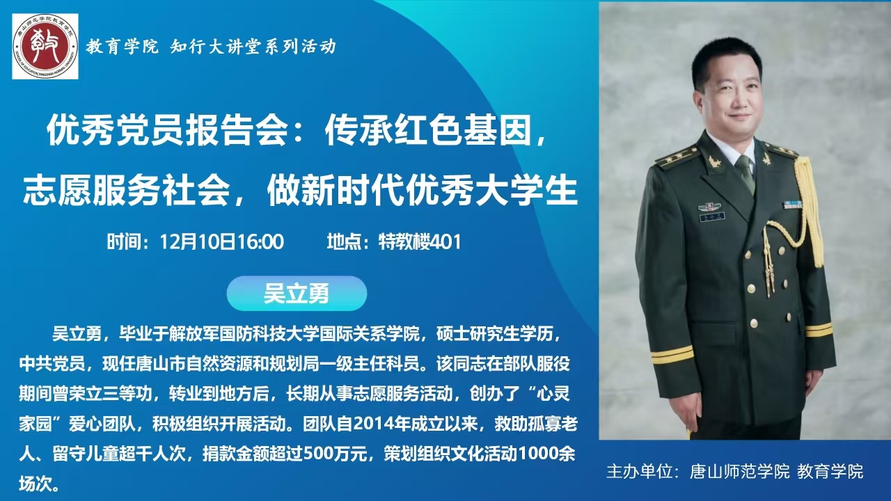 12月10日下午,吴立勇同志于英国上市官网365特教楼401教室举行了主题为“英雄不寂寞,勇者竞风流”的知行大讲堂活动。