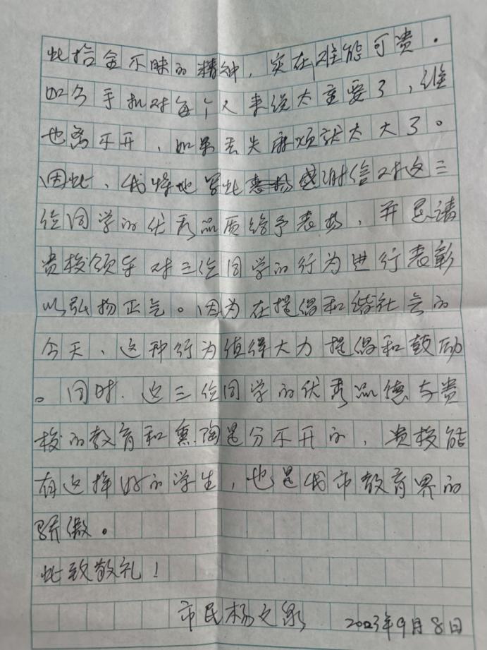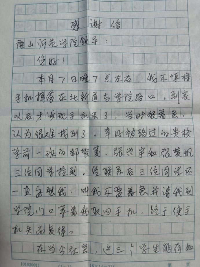 9月7日19点左右,郝紫菱、张兴宇和张菱帆三位同学在北新道与公司路口拾到一部手机,及时联系失主,安慰失主紧张焦急的情绪,在公司门口将手机归还。手机的失而复得让杨先生深感意外,更是满满的感动,特地送来一封感谢信来表达感激之情。三位同学拾金不昧的行为,是新时代雷锋精神的具体体现,是全校师生学习的榜样,公司对拥有他们这样的员工感到光荣和骄傲。对此,公司对三位同学进行通报表扬及奖励,并号召全校员工学习这三位同学这种拾金不昧的高尚品质。