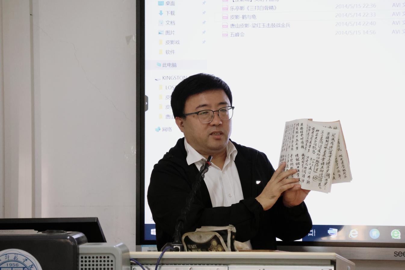 唐山皮影初创于明代末期,迄今已有四百多年历史。其造型精巧、色彩绚丽,在艺人操控下借助灯光投射于白幕,演绎古今故事,被誉为“指尖上的艺术”。活动中,周学军先生从皮影戏的定义、历史渊源、制作工艺、影卷结构及表演特点等方面,系统阐释了唐山皮影的艺术特色与文化内涵。